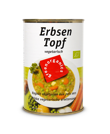 Wasser, Erbsen* (26%), Kartoffeln*, Zwiebeln*, Karotten*, Gemüsebrühe* (Meersalz, Zwiebeln*, Karotten*, Lauch*, Pastinaken*, Petersilie*, Curcuma*, Knoblauch*, Muskatnuss*, Liebstöckelblatt*, Pfeffer*), SELLERIE*, Sonnenblumenöl*, Meersalz, Verdickungsmittel: Guarkernmehl*, Pfeffer weiß*, Curcuma*, Dextrose*.