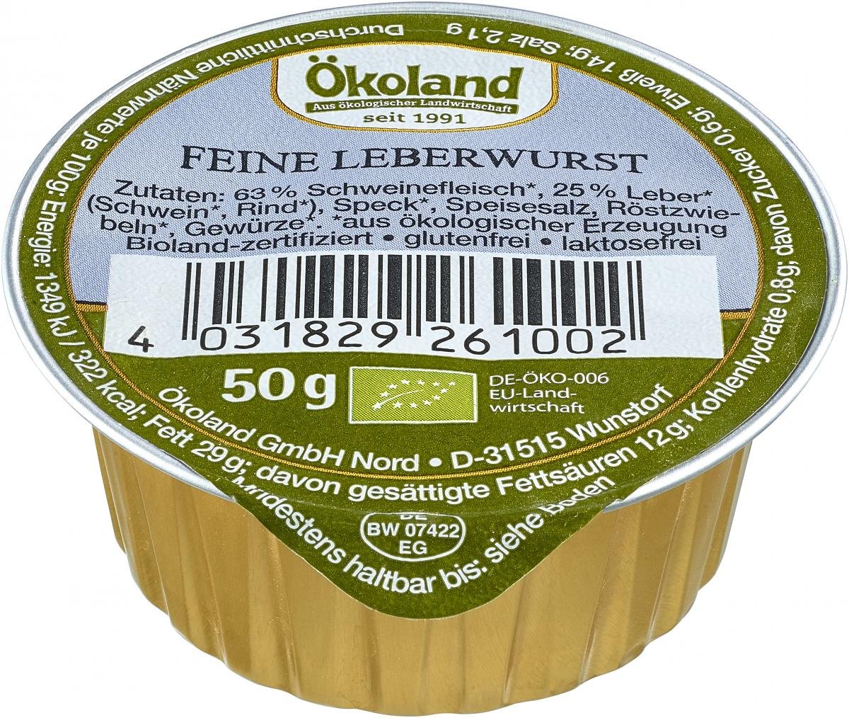 Die Ökoland Feine Leberwurst wird aus Bio-Schweinefleisch und Bio-Schweineleber in Gourmet-Qualität hergestellt. Die feinen Gewürze geben der Wurst einen runden und angenehmen Geschmack. In der kleinen Portionsdose lässt sich die Wurst handlich bevorraten und ist für Flexitarier- oder Single-Haushalte perfekt geeignet. Ohne Zusatzstoffe und ohne Zugabe von Aromen und Zucker hergestellt.