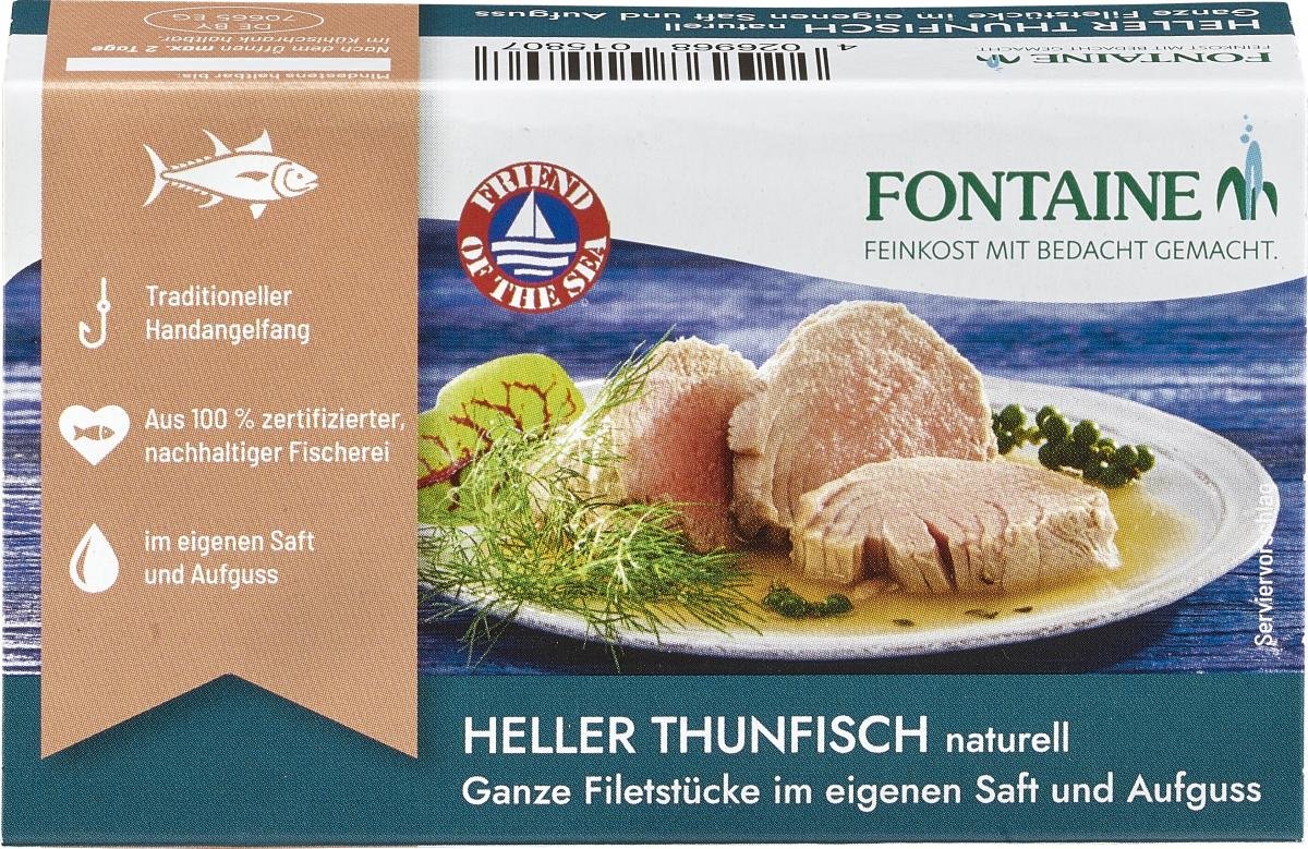 Fontaine Heller Thunfisch wird nach den Richtlinien der Nachhaltigkeit einzeln mit der Angelrute aus dem Wasser gezogen. Nach dem Handangelfang folgen die verantwortungsvolle Verarbeitung und die Verfeinerung mit besten Bio-Zutaten. Diese Vollkonserve enthält neben dem Thunfisch ausschließlich Wasser und Meersalz.