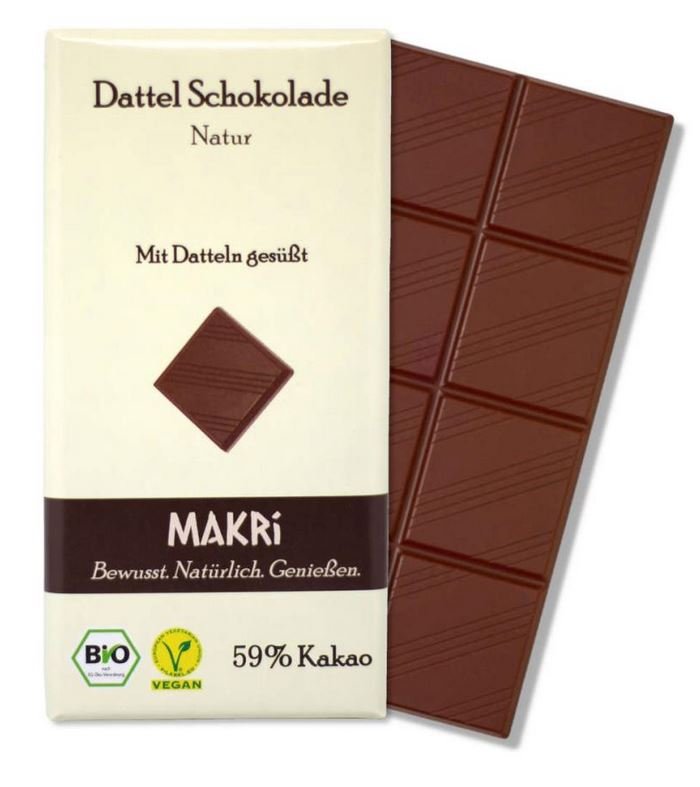 Die MAKRi Natur 59% offenbart, besonders für Liebhaber von natürlichem Schokoladengenuss, ein außergewöhnlich süßherbes Geschmackserlebnis. Die besondere, karamellige Süße von erlesenen Deglet Nour Datteln aus Tunesien harmoniert in angenehmer Weise mit dem feinherben Edelkakao der Dominikanischen Republik.