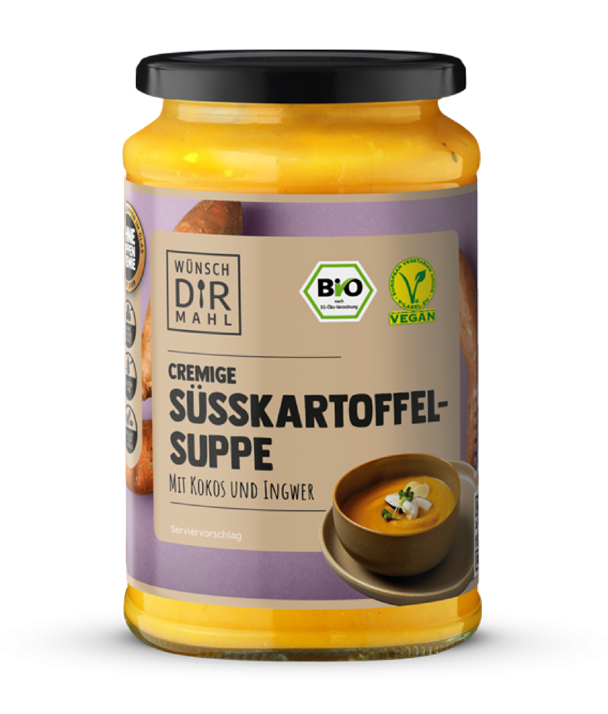 Wir vereinen Süsskartoffel, Möhre und Linsen zu einer leichten und bekömmlichen Mahlzeit für Zwischendurch. Verfeinert mit Kokos und Ingwer erhält sie den besonderen Wünsch Dir Mahl Charakter