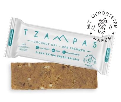 Der Energieriegel Coconut Oat – Der Träumer ist der erste TZAMPAS Riegel aus geröstetem Hafermehl. Die besonders aromatische Mischung aus Kokos- und Mandelmus harmoniert hervorragend mit der Zartbitterschokolade, ohne dabei zu süß zu sein. Ob auf einsamen Berggipfeln, den Weiten blühender Felder oder im wilden Durcheinander der Großstadt- der Träumer macht seinem Namen alle Ehre und entführt dich im Nu and die schönsten Südseestrände.