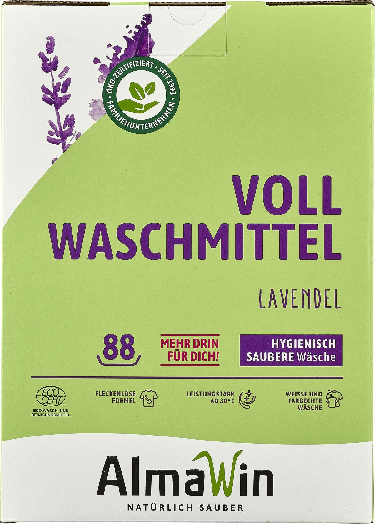 AlmaWin Vollwaschmittel zeichnet sich durch seine hervorragende Waschkraft bereits ab 30 °C aus. Ein Waschkraftverstärker aus aktivem Sauerstoff entfernt selbst schwierige Flecken und lässt weiße Wäsche nicht vergrauen. Es enthält gentechnikfreie Enzyme sowie Reisstärke und sorgt für gute Griffigkeit und einfaches Bügeln.