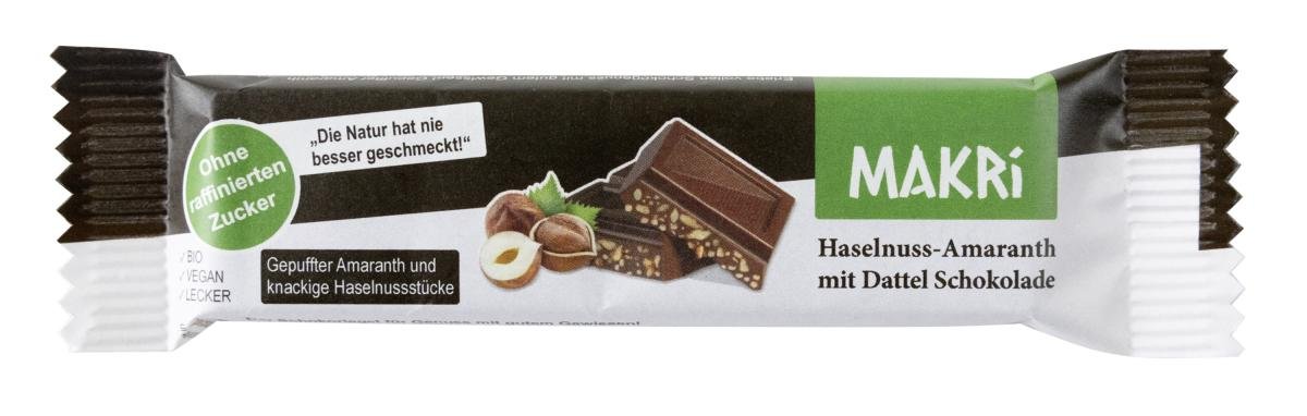 Der MAKRi Haselnuss-Amaranth Riegel ist mit gepufftem Amaranth und knackigen Haselnussstückchen, die von cremiger Dattel Schokolade überzogen werden. Der leckerste Schokoriegel, den du je probiert hast und das komplett ohne raffinierten Zucker.