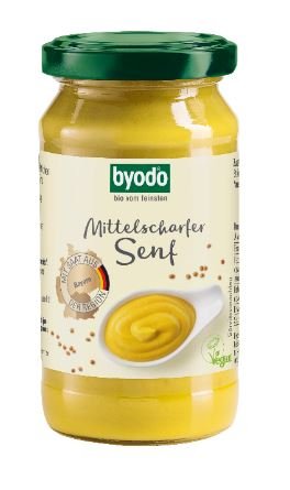 Der mittelscharfe Bio-Senf von Byodo schmeckt nicht nur zu Wurst und Käse, sondern verfeinert Dressings, Suppen sowie Fisch- und Fleischgerichte.